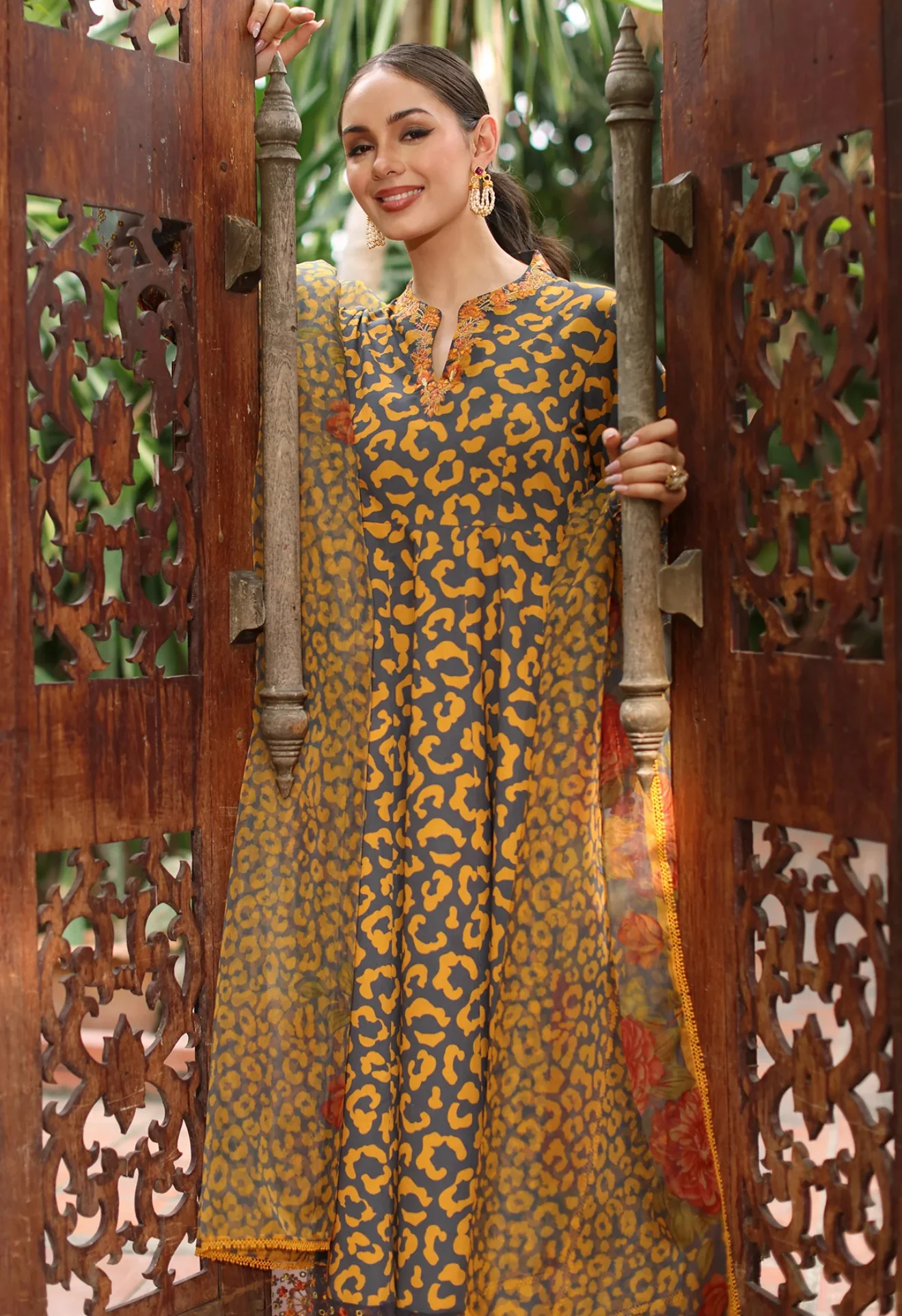 A classically chic composition is portrayed on this style statement outfit. It features a contemporary off white shirt beautifully adorned with captivating floral designs embroidered with cross stitch technique. Paired with a trendy printed culotte trouser adorned with attractive prints. A great addition to your spring season wardrobe.