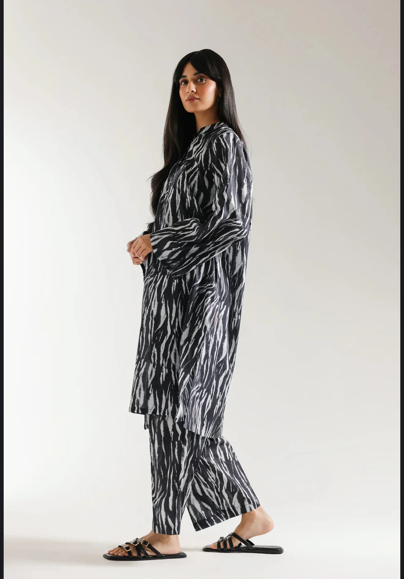 A contemporary composition is layered on this trendy silhouette shirt beautifully adorned with captivating artistic animal pattern printed in an attractive color portrayed on a deep black canvas. Paired with a matching trouser, this style statement outfit is a perfect option for you to embrace this spring season.