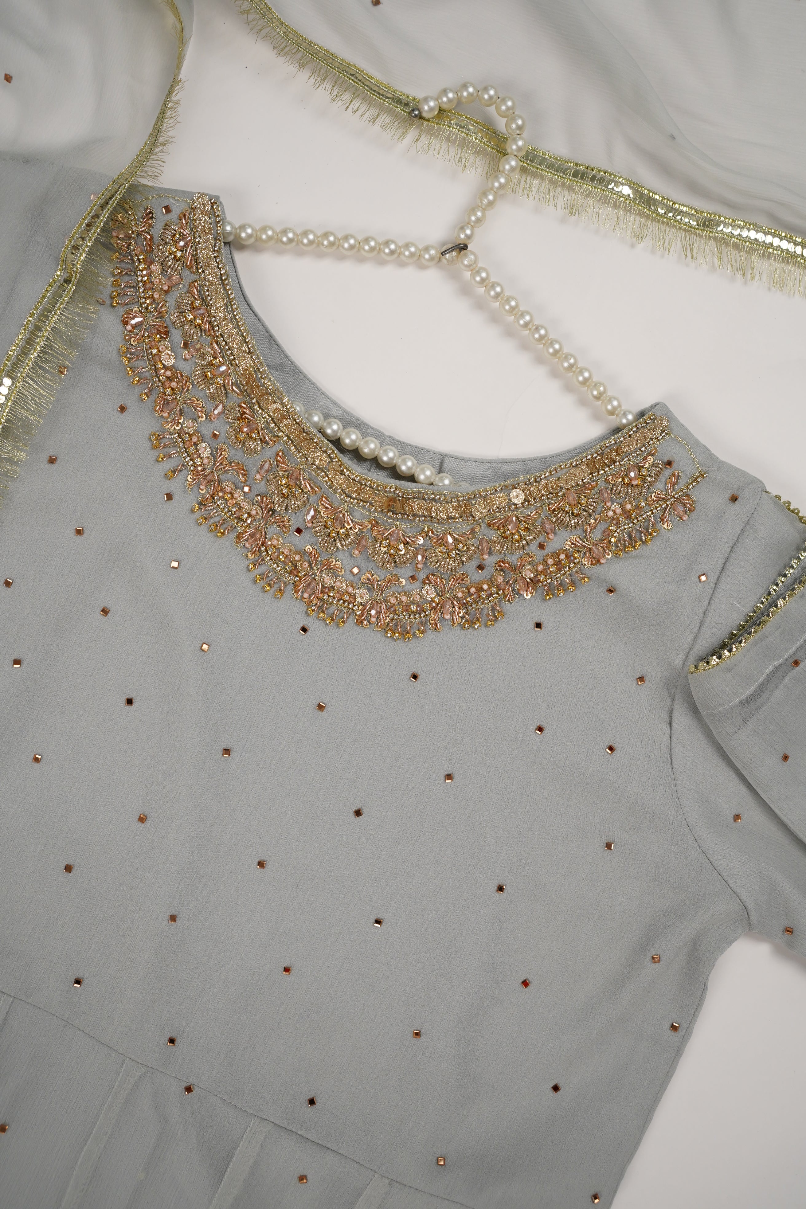 A Shafoon maxi dress is a flowing, floor-length dress made from chiffon fabric. It's known for its lightweight, sheer, and airy qualities, making it a popular choice for Part Events and For Eid  events. The dress typically features a loose, comfortable fit, with a variety of styles including those with sleeves With fully Adhaa WorkÂ
