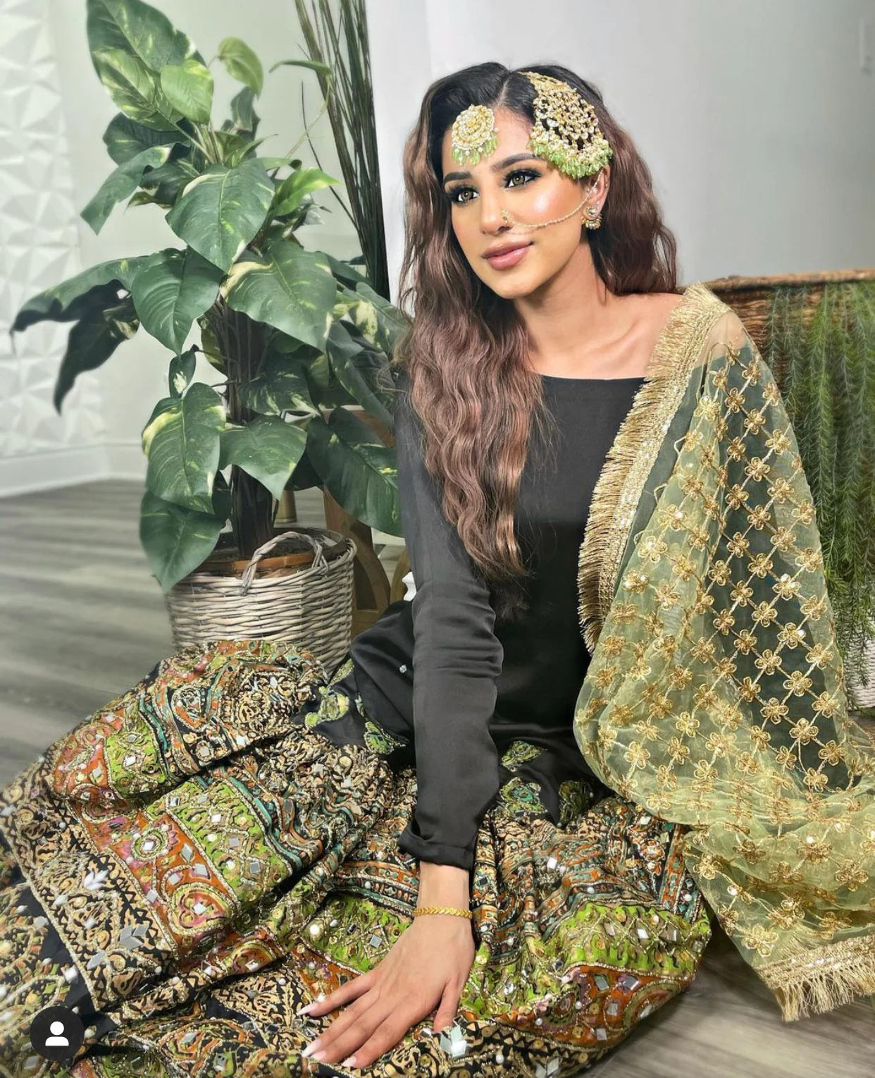 As this garment features detailed handwork, minor paint or glue marks may be visible. Due to the intricate and heavily patterned gharara design, these are minimal and hardly noticeable.