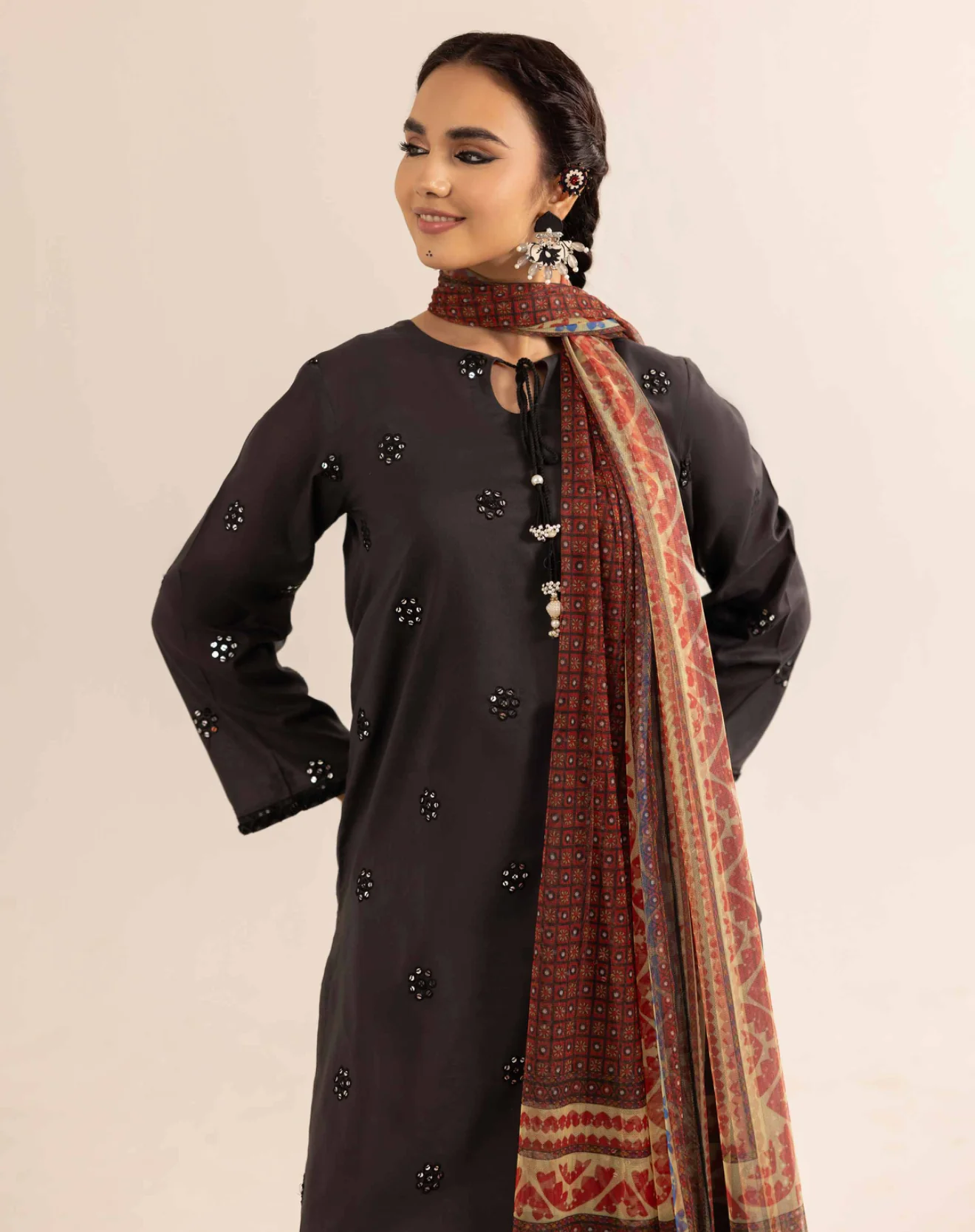 A beautifully crafted top, matching bottom, and a delicately embroidered dupatta. The luxurious fabric and meticulous handwork seamlessly blend classic charm with modern sophistication. Perfect for elevating your Eid celebrations with grace.