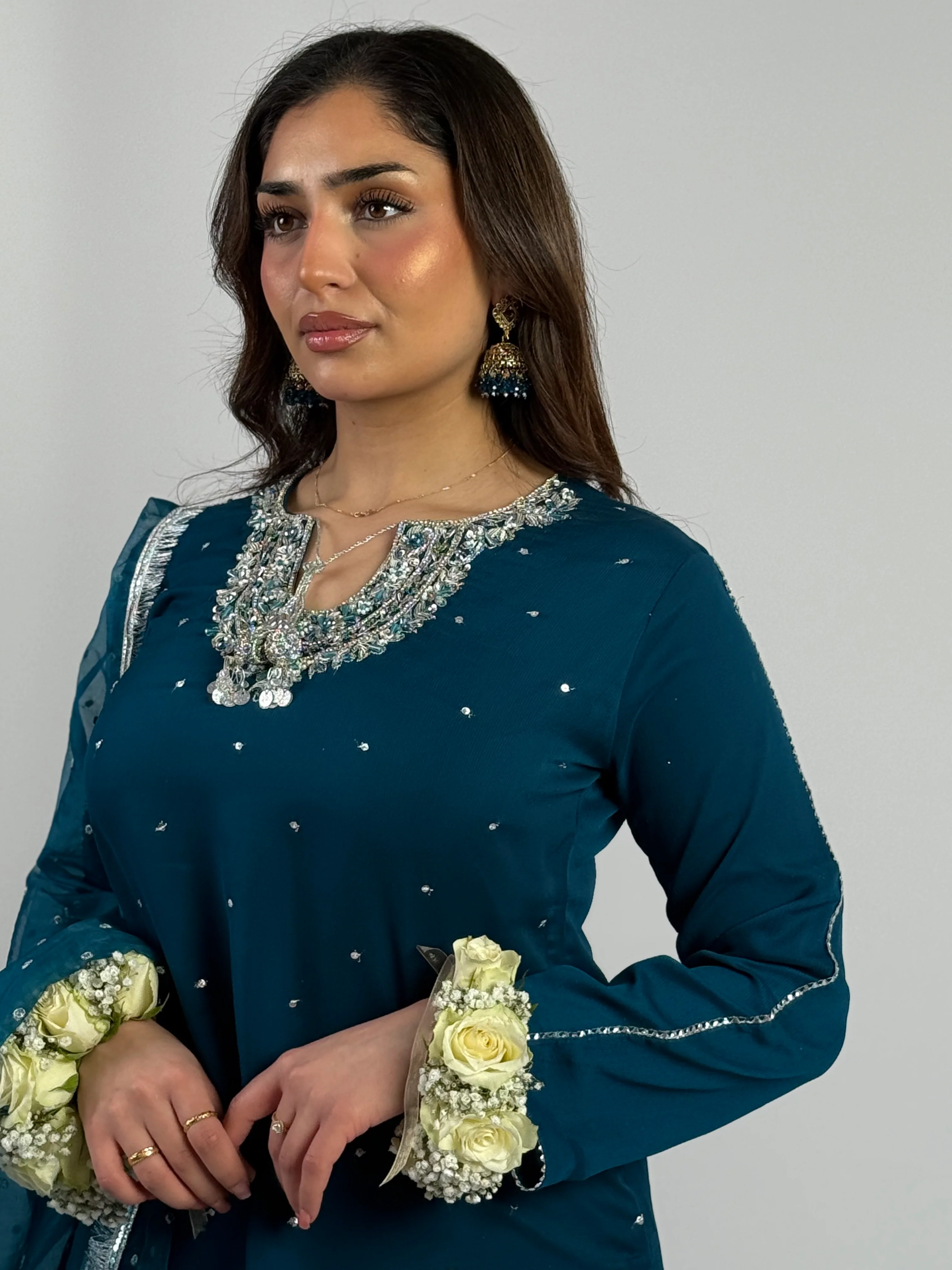 Chiffon farshi shalwar suit is a traditional South Asian outfit The suit is made from shafoon fabric, known for its lightweight and sheer texture, which gives the outfit an elegant and flowing appearance. The kurti can vary in length and design, often featuring intricate embroidery, embellishments, or detailed patterns. The chiffon farshi shalwar pants are wide from the knee down, creating a flared silhouette, and the dupatta is used to drape over the head or shoulders, completing the ensemble.
